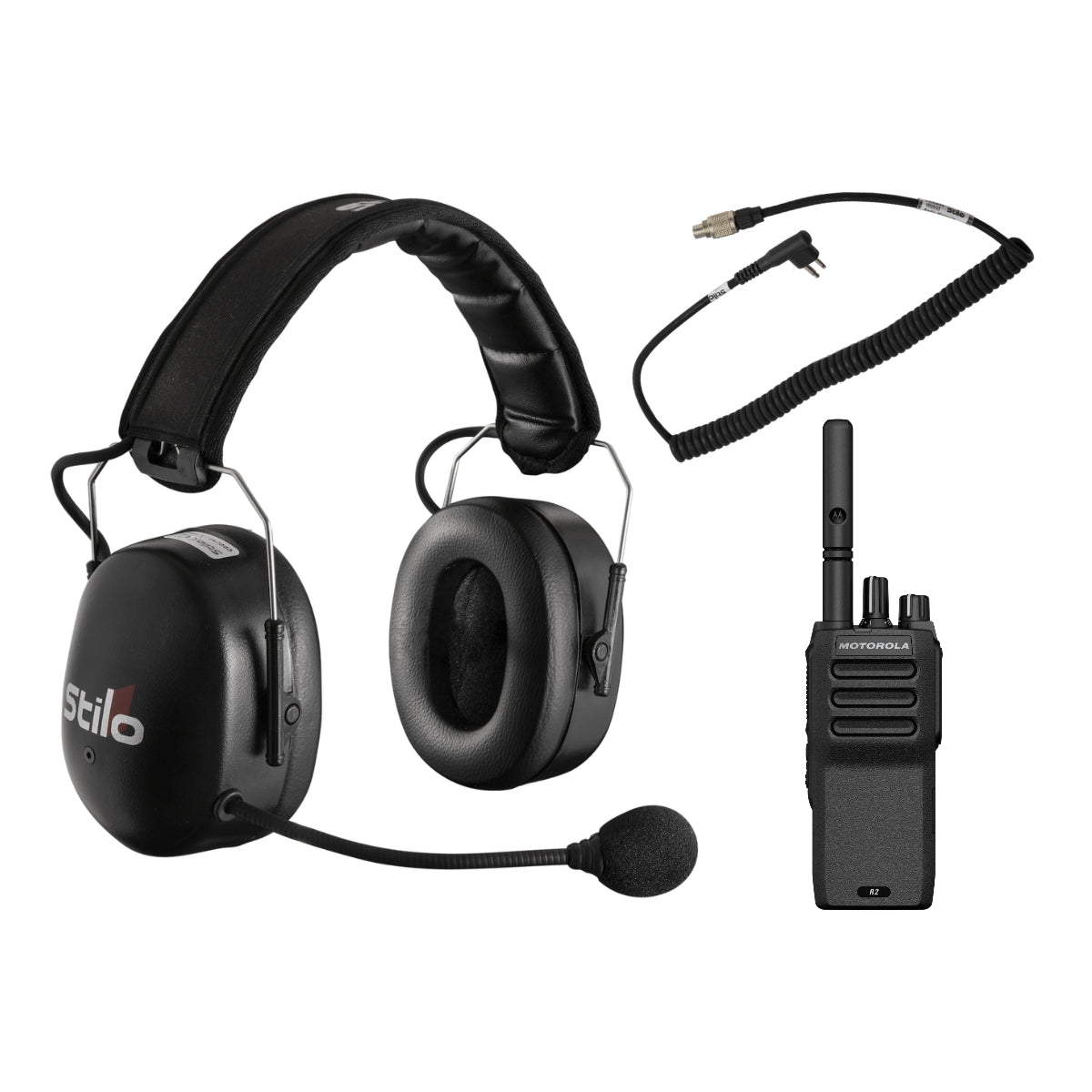 Allowing communication with the car from the pit, this kit consists of headsets with adjustable earmuffs for noise reduction, wiring cable specifically for Motorola portable radio and one unit of portable Motorola R2 radio itself.